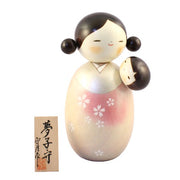 The title of this kokeshi is "Yumekomori". The doll express mother lull her baby to sleep. It seems that the baby is sleeping and good dreaming. The expression is soft and warmly. The pattern of kimono is cherry blossoms and beautiful light pink.